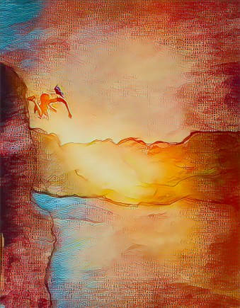 This boy, he shifts his weight onto his back foot and his muscles tense and in one fluid movement he powers toward the cliff edge and leaps out and for an instant his body is framed by the sun, knees tucked into his chest, arms spread wide.
