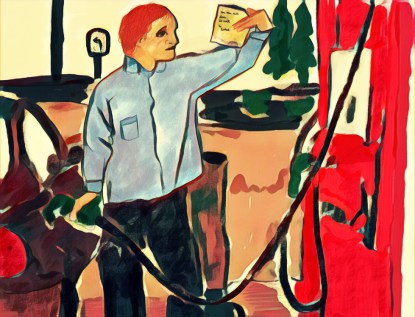 A moment later, as I was finishing with the pump, another man pulled up close to my car on the other side and rolled down his window. I did the same, thinking about godfathers and god I guess and giving someone the job of godfather, someone who would step up and be the father, god forbid. And the man in the car with the window rolled down said, so softly, “I’m just asking for some help.” There we were. I opened my wallet. I had a five and I said I can give you this. He nodded but he didn’t move. He sat looking straight ahead, just sitting in his car. It was my job there at this BP to get out of my car and walk to his and give him the five dollars, so I did.