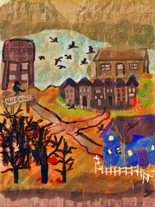 after this sign, before any other houses, there’s one house, an empty house, also humpty-dumptied, sharp and splat, and on this house’s pieces, there are always at least thirteen crows, and, if you follow the crows as they take turns flying in the sky, you’ll see a water tower that, legend has it, was once the loveliest blue of all the blues, but is now brown-red with rust, and, next to this water tower, up on a high hill, there’s another house, big, but not at all beautiful, and this house looks down upon rows and rows and rows of rowhouses, which aren’t rowhouses, really, because they each lean just a bit to the left, close, but not quite touching. And all of these rowhouses have squirrels in their attics and snakes in their basement, and, in three or four or eleven of them, the squirrels and snakes share acorns and mice with one or two ghosts, and between these ghosts and vermin, there are people, of course: a middle-aged man who’s always praying, a youngish man who’s always digging, a ole Mrs. who’s always complaining, usually about someone trying to poison her food (Girl, girl, look! Bits of this bread are blue!); and when someone here gets angry, they get so angry, our teapots whistle, and when someone here cries, they cry so hard, the pipes leak, and none of us, not a one of us, can get our radios to play a happy tune and the mail, if it arrives, arrives in gray envelopes and the air always smells of bad fruit and on and on and on. And on and on, beyond these strange rowhouses, there’s a main street that’s not called Main Street; in this town, it’s called Second Street. And on Second Street, there’s a brown-stoned bar that only serves house wine and whiskey, a butcher shop, a café with just one table, a pain management center, a dentist, and, further down, a school. And in this school, the Simpson sisters whisper about a boy, real, but unreal, who haunts the abandoned 7-11, a beautiful monster boy who, if you’re not good and careful, will steal your soul; and the Donny-boy brothers, real, not unreal, talk loudly about a horrid girl, a devil girl, a dead girl, who, if you’re foolish enough to fall in love, will sneak into your bed and rip out your heart; and all of the kids, they whisper about that big house on the hill and how it must mark, it has to mark, the end of the world, even though, beneath that home (and its hill), there are a few nice houses with 300% less ghosts and 500% more backyard. And just past those houses, finally, there’s the other end of town, which, too, is surrounded by dead apple orchards, and, in this part of the orchards, there are sharp-beaked birds that hiss and deer that spit and fires that sometimes just burn and burn and burn; but if you were to try, maybe, if you were to try, finally, if you were to hop in a thick-tinned car, say, and get through this batch of dead orchards and all its little fires, then, I think, you’d come out on a dirt road, and along that dirt road, eventually, you’d find a proper ramp, and if you found that proper ramp, you could cruise the highway, and if you cruised the highway long enough, maybe, just maybe, you’d find grass that is green and sky that is blue and corn that is fed and, I don’t know, fat cows going moo and, beyond those cows, there’d be another town, a new town, and, in that town, surely, the welcome sign is in one piece, lacquered with all its letters (Welcome!) and the hills aren’t high enough for lonely houses and the mail, instead, is a mountain of invitations and the rain, it never pours. And there, the adults all cut loose, probably, and the kids don’t speak of monsters, maybe, because nothing is haunted or gnarled, and the living things — only the living things, of course — sit together at café tables, eat pie, touch hands, and warm their faces, never hunger, never burn.