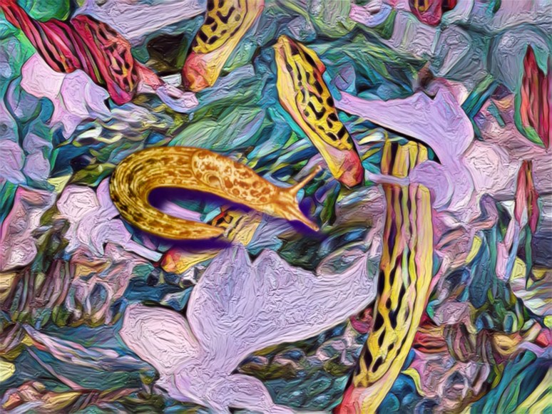My husband-wife will be fine without me. Its tentacles buzzed. They have their own dreams and desires, a thousand logs and leaves to explore. The slug turned to face a hanging fern. Its triangular offshoots, glistening wet, exploded out to reach for light in the rain. My egg-babies do not need me anymore. The forest pulsed and breathed. They will be born, grow, and live—pulled towards their life-journeys by some unimaginable force.