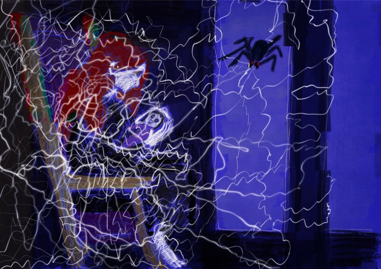 The spider spun the web around the legs of the chair and the witch’s legs that fell between them. The spider spun the web over the lap of the witch and the scraps of daughter that lay there. The spider spun the web around the stitching fingers and up over the witch’s shoulders and all the way to the top of the witch’s pointed hat.