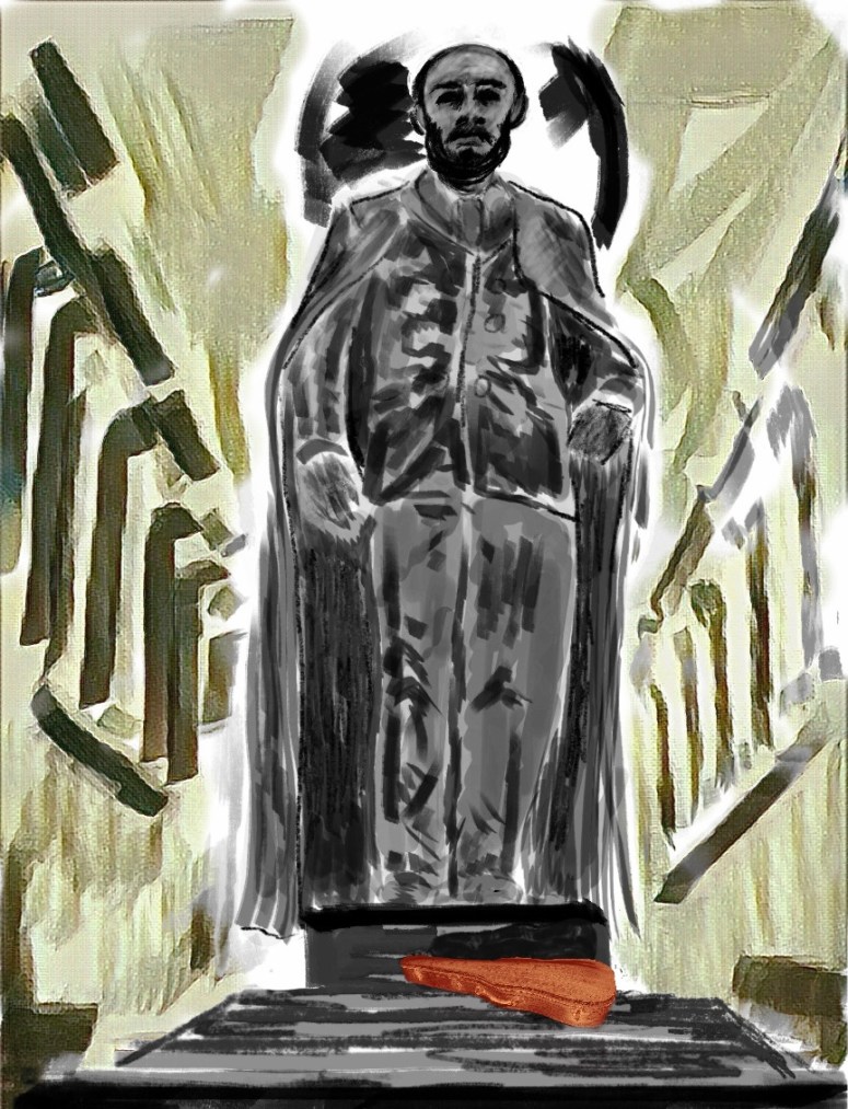 One Sunday morning, as autumn is just beginning, a young woman walks across the square toward the massive statue of Z—. She is inconspicuously dressed in worn but tidy clothes. Even at this hour, the sun plays with the square’s singular statue; as if in a private game. Sunbeams flicker and leap across the uneven bronze. The young woman carries a faded leather case, which she places gently against the statue’s base.