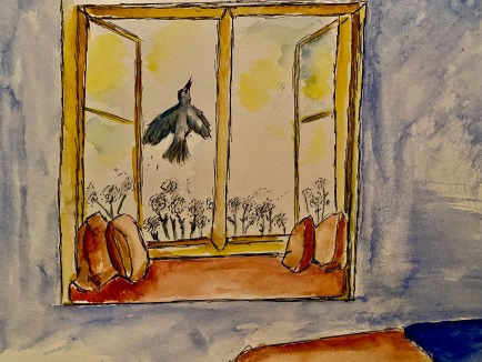 This morning Shirl’s mother leaves early for work and Shirl sleeps in. A good day to skip class. It’s not like Shirl learns anything she doesn’t already know. Throwing off the covers, she pictures the school day as a series of still lifes: Mrs. Arbuthnot standing at the blackboard, waiting for an answer, fingertips dusted with chalk. The front row girls scribbling notes. Shirl’s empty seat in the back. Birds are her real teachers. She kneels by the window, studies the crows’ acrobatic freefall.