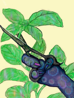 Ocimum basilicum is an easy-to-grow tender herb that likes a warm, sunny site with good air circulation. It is sensitive to frost and cold; wait until the soil and air has warmed (night temperatures consistently above 50°F) to put your plant in a container or in the ground outside. Average to rich, well-drained soil will keep your plant growing well. Water when the top inch of soil is dry, and feed monthly with a balanced fertilizer. Harvest by cutting off branches and removing the leaves. Pinch off flower buds assertively to stop your plant from seeding and keep it producing stems and leaves in the pleasing round shape for which you bought it.