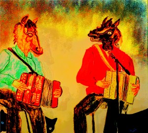 April 26th and things began to get bad, bad. Two men in folding chairs, wearing rubber horse masks, sat and played accordions in the parking lot. They didn’t want money, but several passersby dropped change into a discarded box that was sitting close to the men in horse masks. Some people thought it a joke. Smart ones kept their distance.