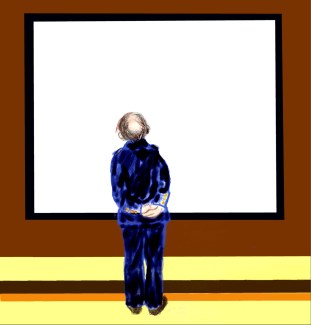 At first, he thought that his being made to stand guard by an empty canvas was some kind of joke, on him, on his worthlessness. He could take it. He was being paid. Then he arrived at a different idea: what if the joke was on everyone else? What if his being made to stand guard was the move that was needed to sell it? Draw in fools. Get them rubbing their chins. Finally he came to a thought that was more like a feeling, since it wouldn’t cohere. He stood guard by an empty canvas in an empty wing at the end of a day. He could be real—an actual man—or theoretical. Who would know? The guard stepped away from his place by the wall. Blinking, he tried to see into the light of the canvas, like it was a mirror.