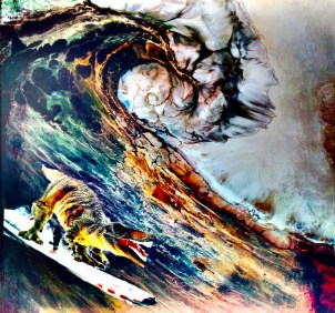 At our high school graduation a local artist delivered the commencement and his last words to us were “remember, kids, you can take the dinosaur out of the wave, but you can’t take the wave out of the dinosaur,” and we all thought it was really cool he said that precisely because it didn’t make sense in any rational way but never in a million years would I have guessed that a day would come when I’d find myself on a beach watching dinosaurs tumble below the crests of the waves and yes there were people on boats pulling them out and lining them up on the sand in forced poses where they looked small and sad though no one could take the embers out of their eyes.
