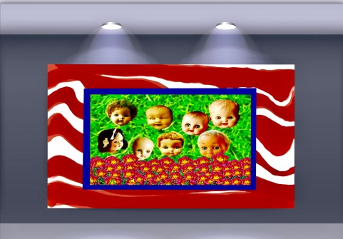 Observe the long row of doll heads in the final room, hung on a rectangular grass panel, surrounded by 200 plastic roses in a synthetic flower bed. To the left stands a single, 10-foot-tall, pink-flowering crab apple.