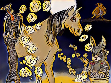 You turned away, saying you didn’t believe in fantasies. I paused, then said if a buzzard sees everything we do and calls out, all will be lost. I said a hare must garland the horse before the sun rises and the sparrows sing. You said, what about the sparrows and the buzzard? I told you if the hare gathers white roses at the summer solstice to make a garland for the horse and feeds the horse wild strawberries then the spirt gods will rise from the earth and all will be well in a marriage. You said you had never heard it and for a moment looked interested. I said do you know the story about the hare and horse? You said on your walk through a meadow of oxeyed daisies, a hare leaped up towards the sun. In a nearby field a brown horse stood motionless as if it were asleep. I told you the wild strawberries were fruiting and when I searched carefully, I found two ripe berries, one for each of us. You looked up and spied a buzzard. I looked up and saw a bank of white wedding roses against a blank sky and two sparrows equidistant on the eaves of the roof. At breakfast on the terrace, we had a row that couldn’t be resolved.